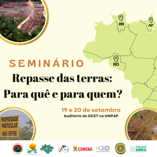 Nos dias 19 e 20 de setembro será realizado o seminário “Repasse das Terras: Para quê e para quem?” no auditório do Departamento de Ciências Exatas e Tecnológicas (DCET) da Universidade Federal do Amapá (Unifap), em Macapá (AP).