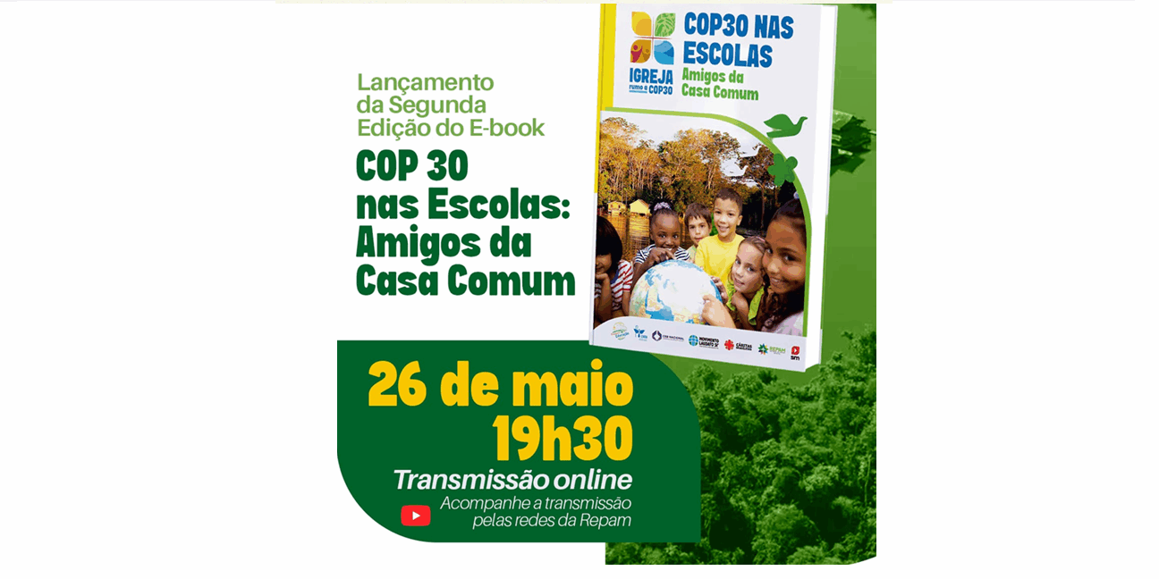 No dia 26 de maio, às 19h30, será lançado o e-book “COP30 nas Escolas: Amigos da Casa Comum” – 2ª edição, uma iniciativa da Pastoral da Educação da CNBB Norte 2, que inspira estudantes, educadores e comunidades a se comprometerem com a construção de um futuro mais justo, solidário e sustentável.
