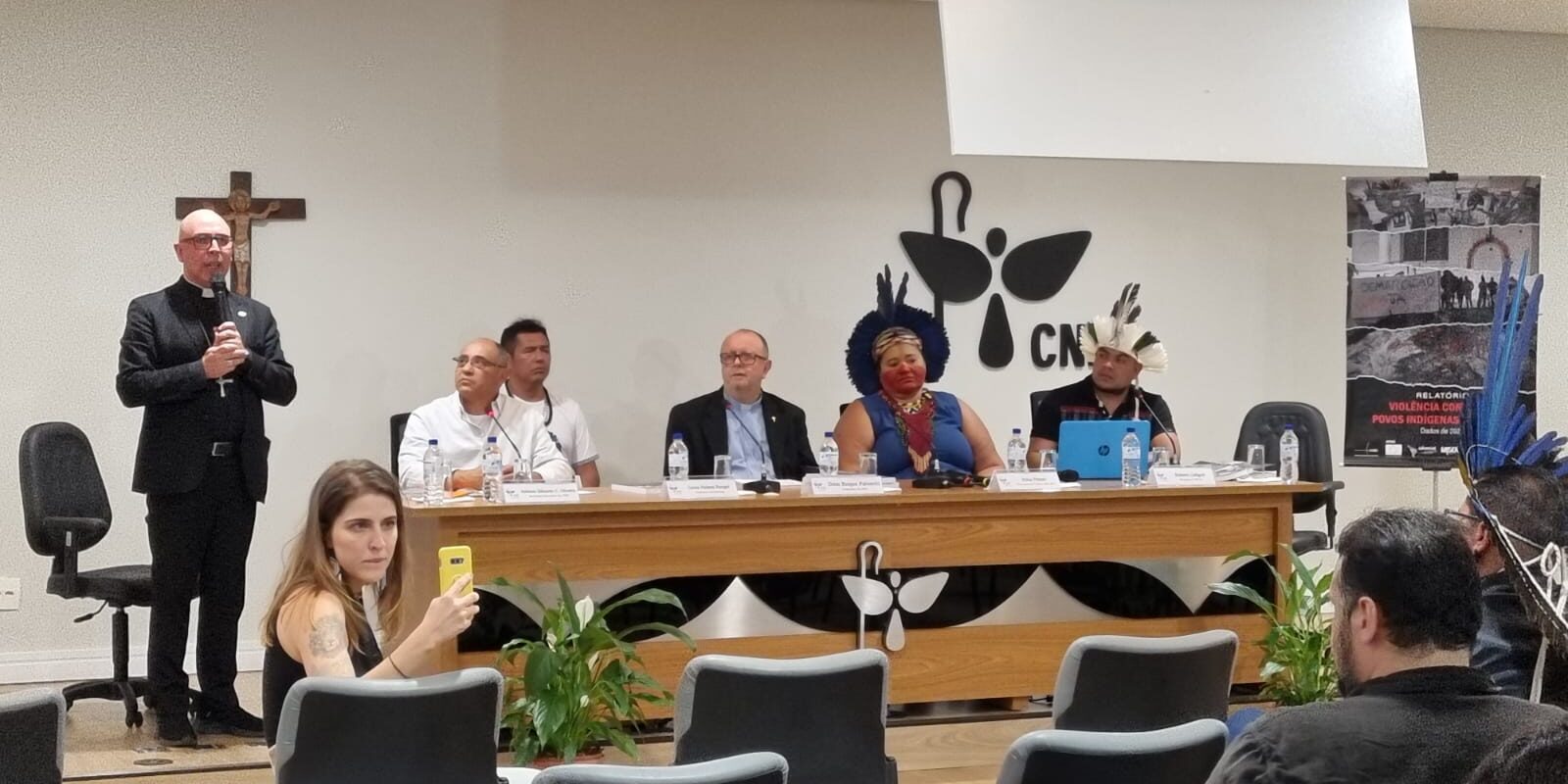 Participaram da mesa de lançamento, o secretário-geral da CNBB, Dom Ricardo Hoepers, o presidente do Cimi e arcebispo de Porto Velho (RO), Dom Roque Paloschi, o secretário executivo do Cimi, Antônio Eduardo Cerqueira de Oliveira, os organizadores do relatório, Lucia Helena Rangel e Roberto Antonio Liebgott, a vice-cacica da Terra Indígena (TI) Barra Velha (BA), Erilsa Pataxó, o líder indígena Guarani Kaiowá (MS), Josiel Kaiowá, e o presidente da Associação Wanasseduume Ye’kwana (RR), Júlio Ye’kwana.