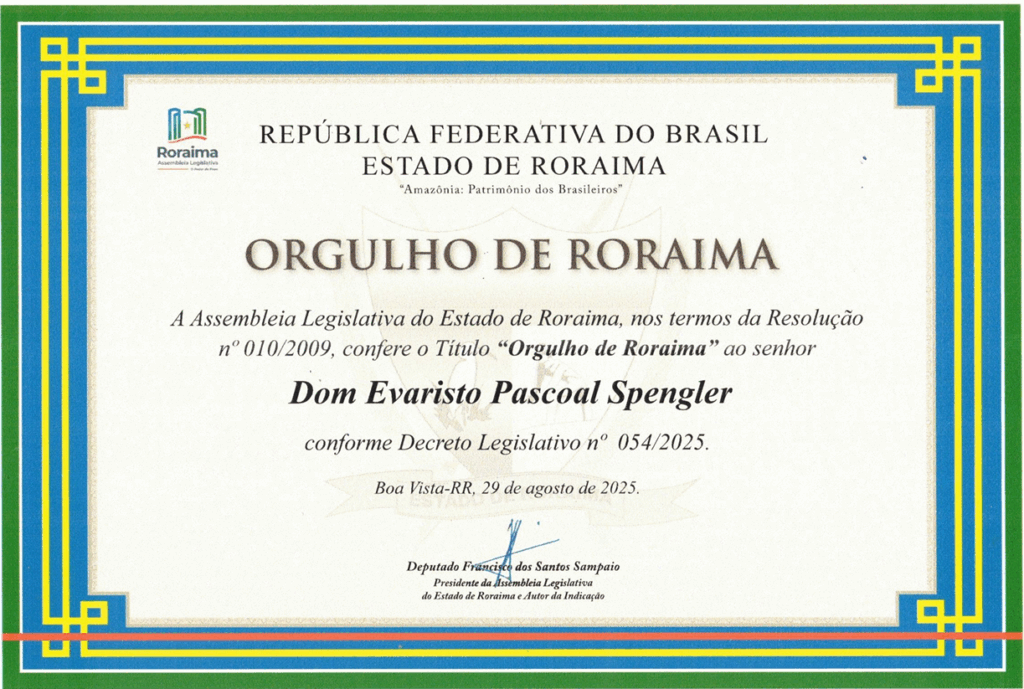A homenagem, aprovada pelos Projetos de Decreto Legislativo nº 51 e nº 52 de 2025, concedeu a Comenda Orgulho de Roraima a diversas personalidades e instituições que representam a presença missionária e social da Igreja no estado, com destaque para Dom Evaristo Pascoal Spengler, bispo de Roraima e presidente da REPAM, reconhecido pelo seu papel pastoral e liderança na Diocese. Também foram homenageados o pároco de Pacaraima, Pe. Jesus Esteban Lopes Fernández Bobadilla, além de representantes de instituições como a Pastoral da Criança, Colégio Claretiano, Cáritas Diocesana e a Articulação dos Serviços Eclesiais aos Migrantes e Refugiados (ASEMIR).