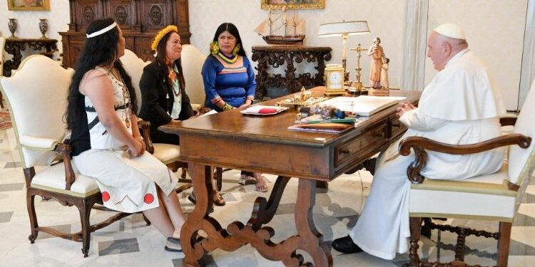 As lideranças indígenas Patricia Gualinga, Irmã Laura Vicuña e Yesica Patiachi entregaram, nesta quinta-feira, 1º de junho, uma série de presentes ao Papa Francisco que as populações da Amazônia lhes enviaram de seu território. Esta delegação da Conferência Eclesial da Amazônia ( CEAMA ) e da Rede Eclesial Pan-Amazônica foi recebida em audiência pelo Pontífice no Palácio Apostólico Vaticano. Eles tiveram “uma conversa agradável, calma e muito confiante”, segundo disseram à mídia vaticana após o encontro.
