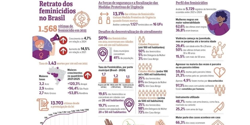 Outro dado preocupante é que 13,1% das vítimas possuíam medida protetiva de urgência no momento em que foram mortas, indicando falhas na efetivação das políticas de proteção. O estudo também aponta que metade dos feminicídios ocorre em cidades com até 100 mil habitantes, onde muitas vezes há menor presença de delegacias especializadas e casas de acolhimento.